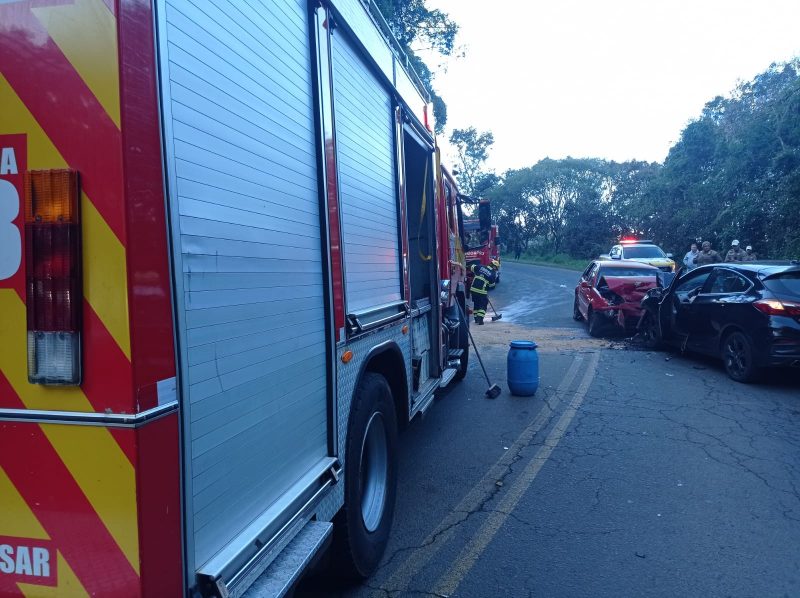 Os dois carros bateram de frente em uma curva. A colisão aconteceu após uma ultrapassagem proibida feito pelo Golf, conforme informou a PMRv. – Foto: Lucas Polak/NDTV Chapecó - 4 de 7
