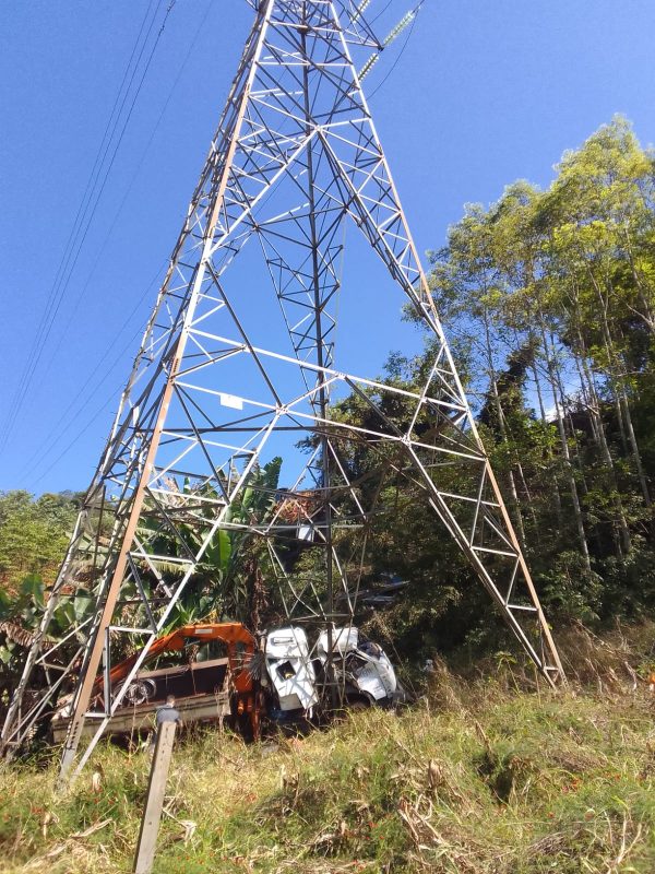 Seis pessoas ficaram feridas após um caminhão sair da pista e cair em uma ribanceira de 50 metros em São Miguel do Oeste, no Extremo-Oeste de Santa Catarina. – Foto: Corpo de Bombeiros Militar/Divulgação/ND - 2 de 5