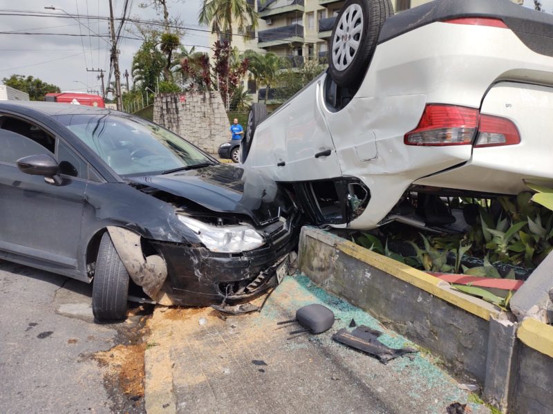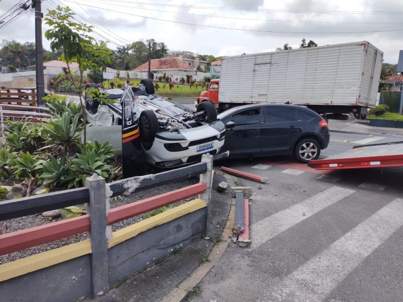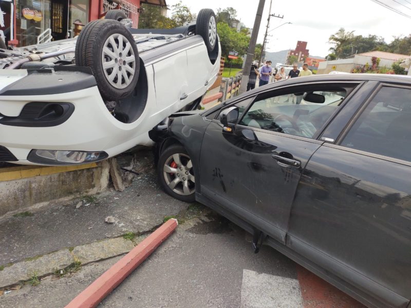 Com o impacto, ele capotou e quase invadiu um comércio na esquina. O veículo parou em cima do canteiro no local. Apesar das imagens chamarem atenção, ninguém se feriu.