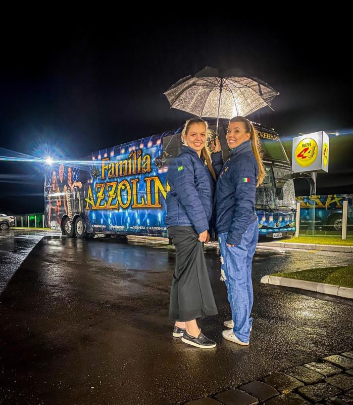 A banda Família Azzolini é de Francisco Beltrão e é conhecida pelas interpretações de clássicos da música ítalo-brasileira. O grupo seguia para Nova Veneza, em Santa Catarina, para cumprir agendas de shows e a gravação de um DVD no próximo sábado.Thaina e Thairine, vocalistas do grupo, chegaram a gravar vídeo no Instagram falando sobre o ocorrido. — Foto: Reprodução/Instagram/ND - 7 de 7