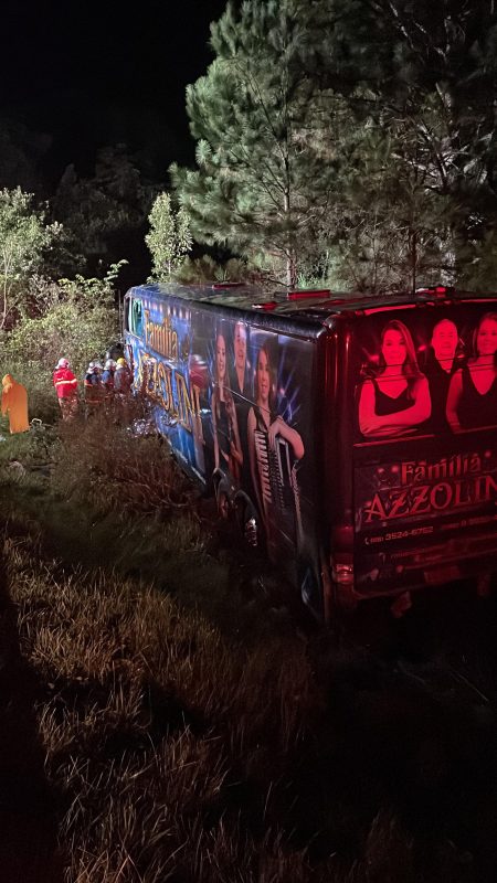 O ônibus parou fora da rodovia e no meio de algumas árvores, como mostra essa imagem divulgada pela Banda. Outras duas pessoas, de 64 anos e 33 anos, tiveram ferimentos. Os feridos foram encaminhados para hospitais da região. – Foto: Reprodução/Instagram/ND - 6 de 7