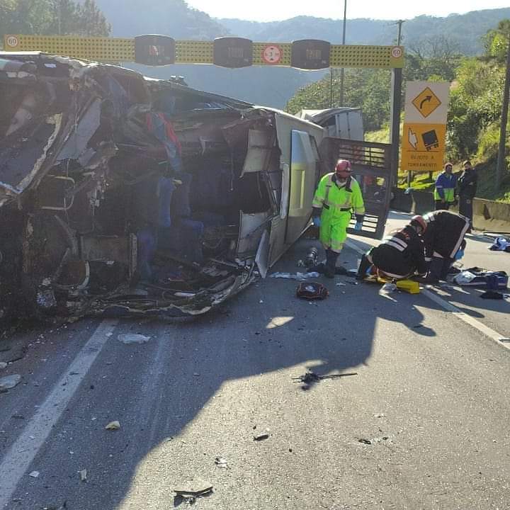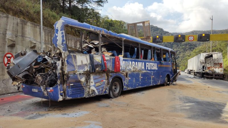 A colisão ocorreu por volta das 8h30 entre um ônibus que tombou, um carro e uma carreta no km 667 da rodovia, em trecho localizado em Guaratuba, no sentido Sul da rodovia. O ônibus transportava a equipe do Umuarama e duas pessoas morreram no local. – Foto: Divulgação ND