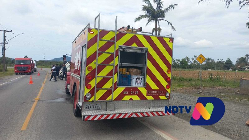 Os bombeiros foram acionados para avaliar o vazamento de diesel no local após o tombamento.