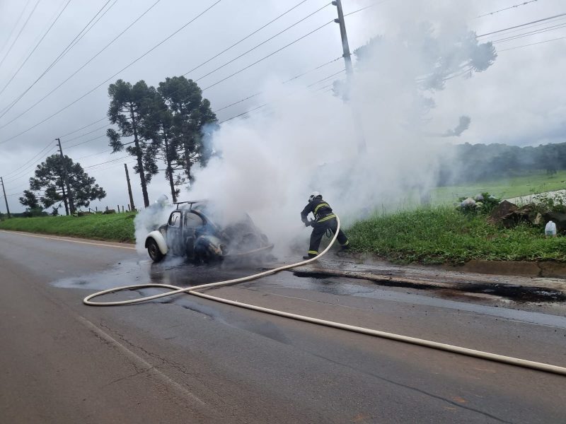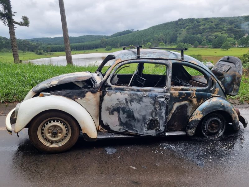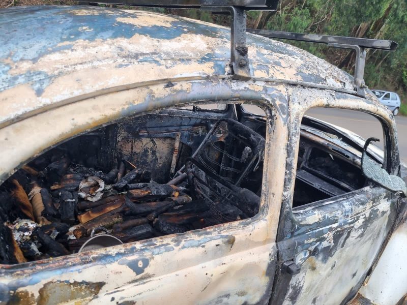 Segundo o Corpo de Bombeiros Voluntários de Caçador, que atendeu a ocorrência, o fogo começou por volta de 12h25 e consumiu rapidamente o veículo, que ficou totalmente danificado. Foram necessários 1000 litros de água para apagar as chamas e fazer o rescaldo. — Foto: Corpo de Bombeiros Voluntários de Caçador/ND - 3 de 4