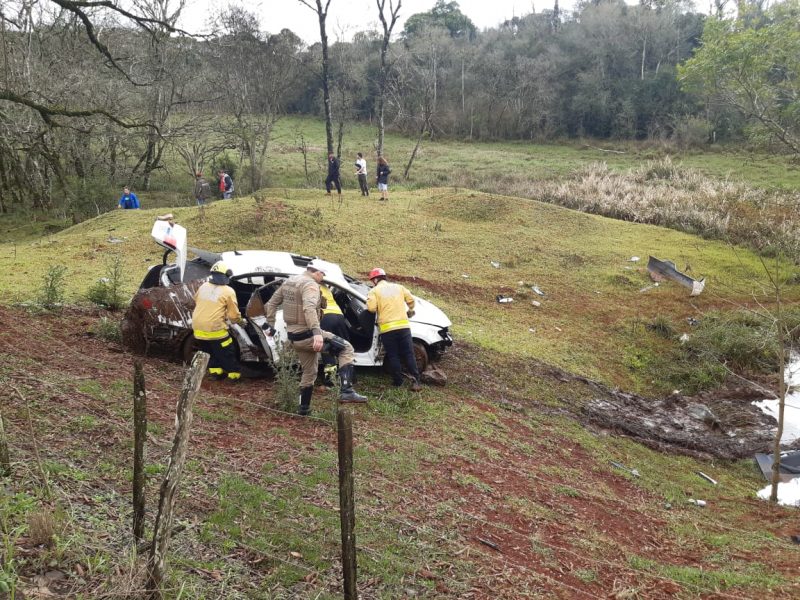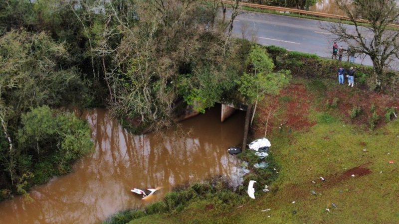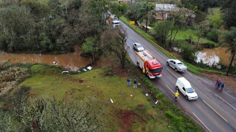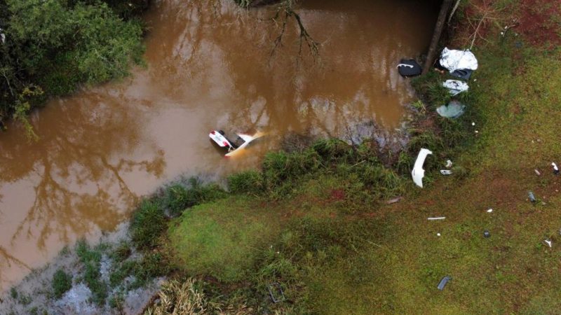 As imagens aéreas revelam que o veículo saiu da rodovia estadual, desceu uma ribanceira e acabou caindo no rio Simonetto. No momento, não existem informações oficiais sobre as causas do acidente. – Foto: Alexandre Madoglio/NDTV/ND - 5 de 5