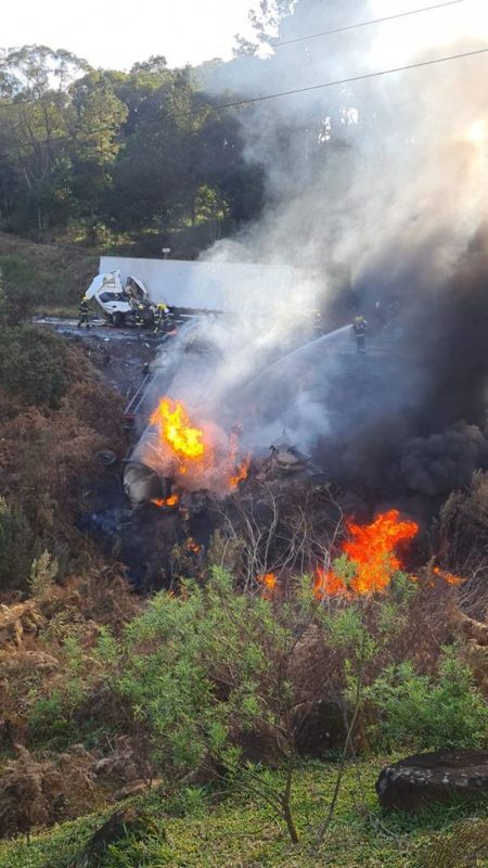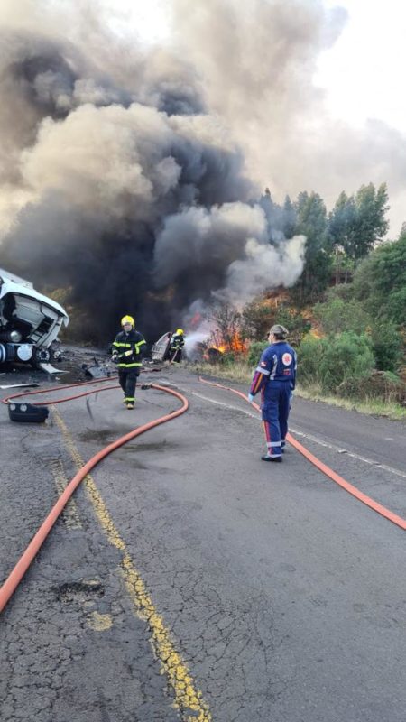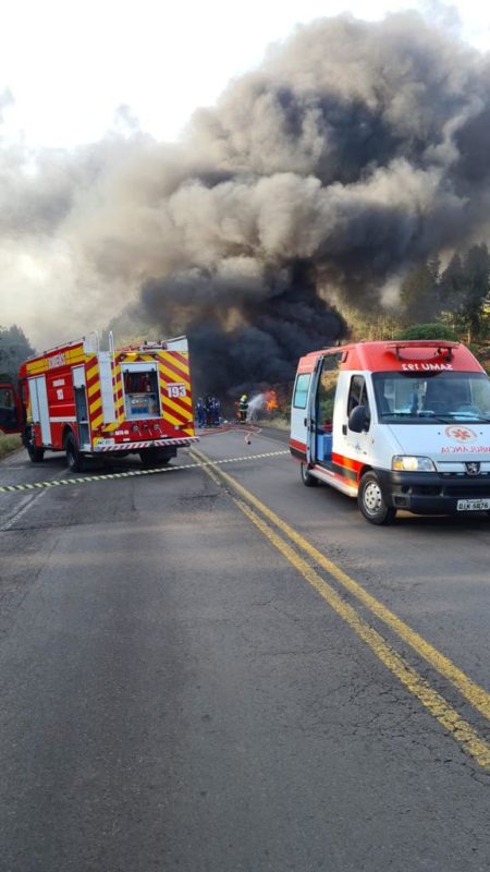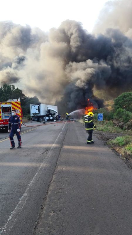 Violenta batida entre dois caminhões na rodovia BR-282 causa incêndio em Ponte Serrada. – Foto: Corpo de Bombeiros/ND - 3 de 7