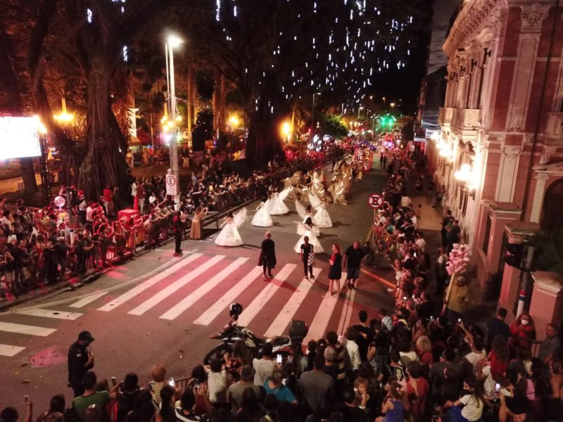 A expectativa para o primeiro dia de desfile de Natal no Centro Histórico de Florianópolis estava no ar. Pelas ruas de acesso à praça 15, famílias se organizavam no início da noite para garantir o melhor lugar para assistir ao espetáculo que faz parte do Natal da Virada organizado pela prefeitura. Tudo isso porque na noite desta quinta-feira (16), um dos pontos mais conhecidos e tradicionais da Ilha de Santa Catarina, sendo a região da Catedral e da Praça XV, recebeu moradores e turistas para acompanhar a chegada do Papai Noel no local. – Foto: LEONARDO SOUSA/Divulgação - 5 de 5