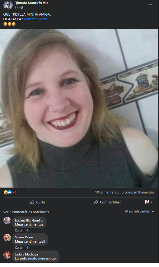 SeguirNas redes sociais, amigos e parentes lamentaram a morte de Maristela de Melo, que trabalhava em uma rede de supermercados em São Bento do Sul e era muito querida por todos.