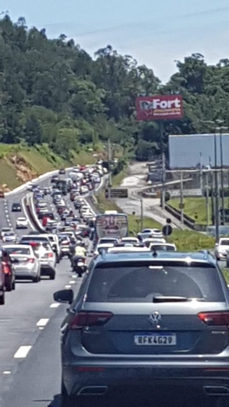 A opção acabou sendo a mais procurada depois que foi registrado um acidente na BR-101, retendo o trânsito em pelo menos 1km, conforme a concessionária Arteris Litoral Sul, que administra o trecho. As fotos registraram o trânsito nas proximidades da Balsa da Barra do Rio – Foto: Divulgação/ND - 4 de 7