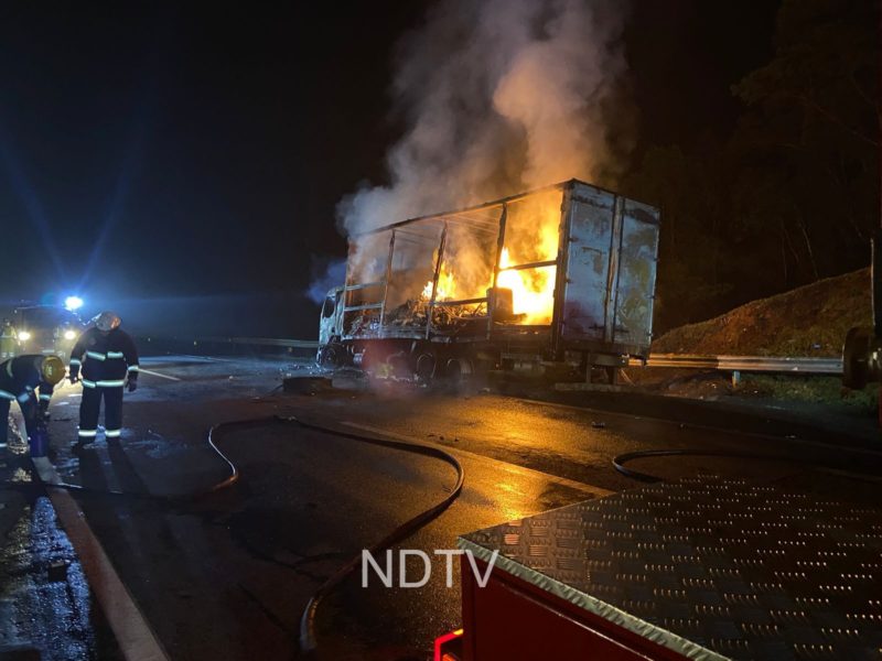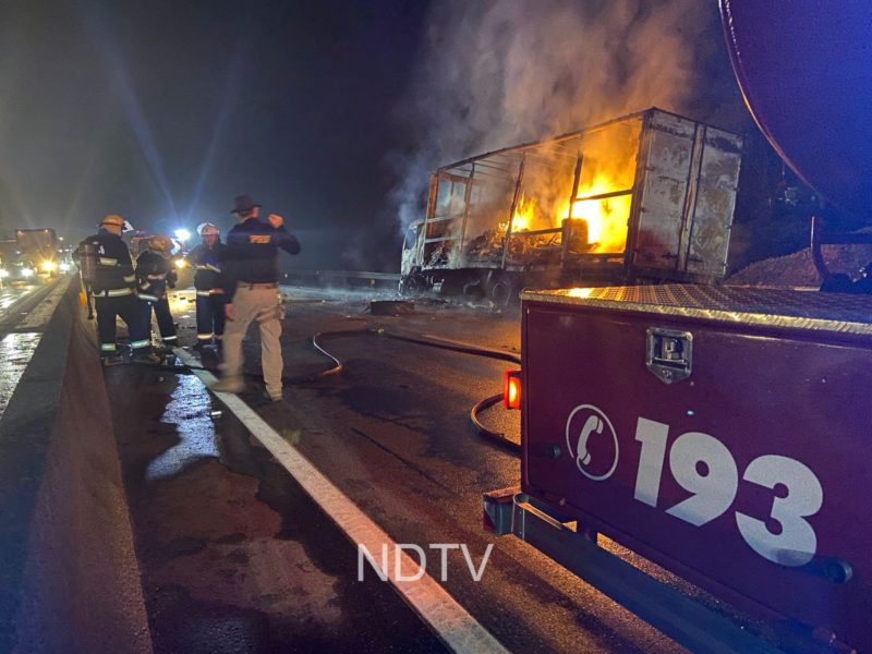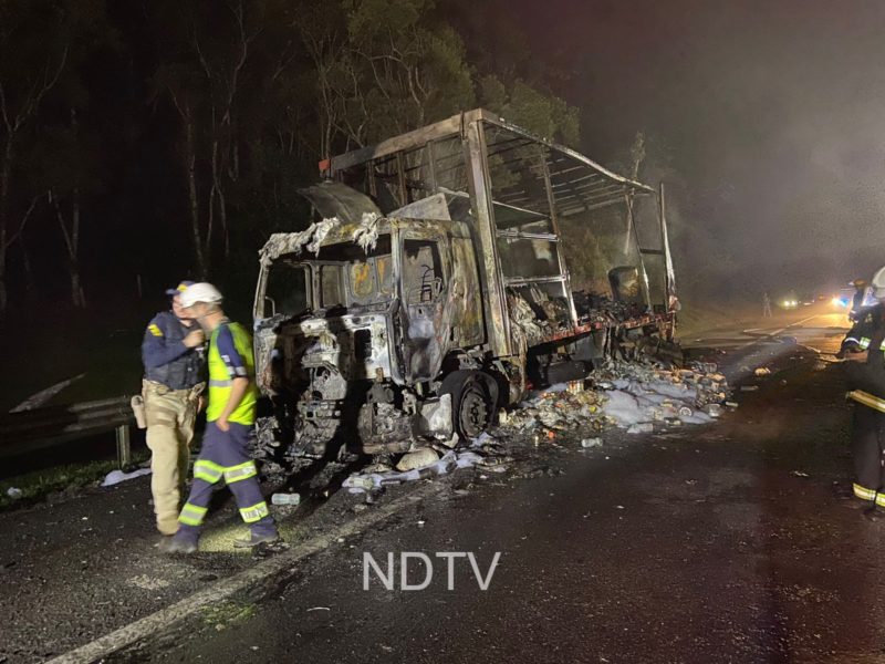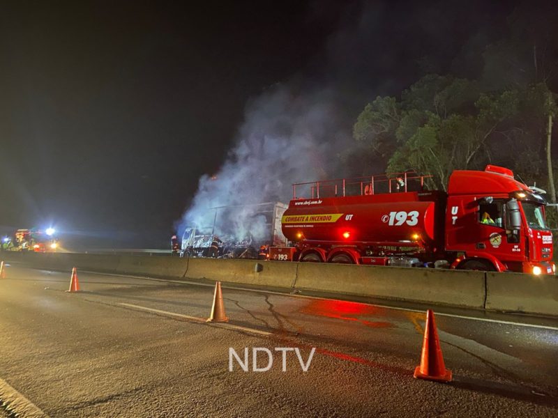 Caminhão ficou destruído após pegar fogo na BR-101 – Vídeo: Ricardo Alves/NDTV