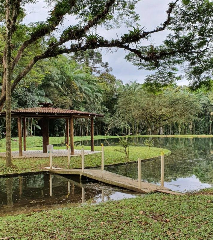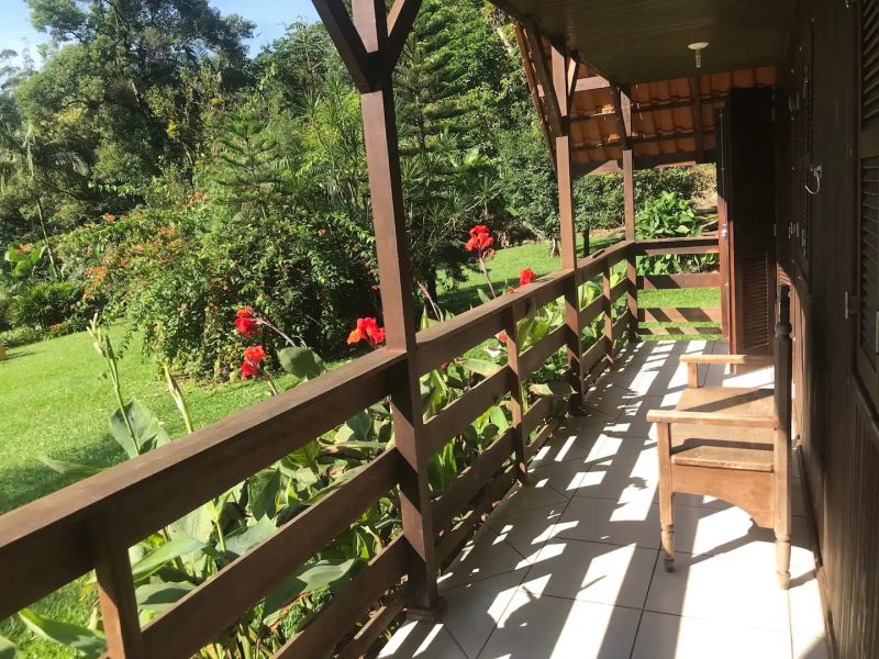 Chalé com cachoeiras e trilhas: localizado em Jaraguá do Sul. Trilhas na mata, riacho e cachoeira a cerca de 200m da casa, lindos jardins bem cuidados e vários pássaros nativos e viajantes que vêm se alimentar. Pesque no açude, colha banana, limões e outras frutas. Durma e relaxe com o som das águas e das cigarras, esqueça o estresse da cidade. – Foto: Reprodução/Airbnb/ND - 17 de 18