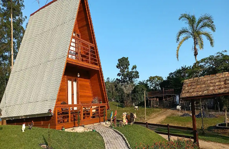 Chalé com lareira e fogão à lenha: localizado em Jaraguá do Sul. Espaço está rodeado por mata atlântica, têm estilo rústico e aconchegante, e é ideal para quem quer fugir da correria urbana. Os visitantes têm a possibilidade de entrar em contato com a natureza e os animais que estão soltos na fazenda. Aceita pets de hóspedes. – Foto: Reprodução/Airbnb/ND - 11 de 18