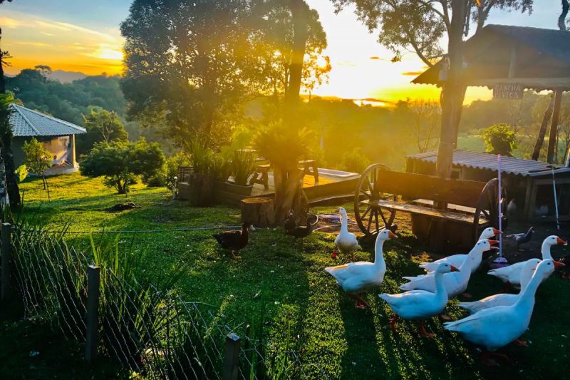 Cabana do Vale – RANCHO KÜNZEL (Campo Alegre): localizado em Condomínio Fechado, é bem arborizado. Os hóspedes podem usufruir de toda a propriedade e fazer caminhada e interagir com os animais. – Foto: Airbnb/Divulgação - 10 de 24