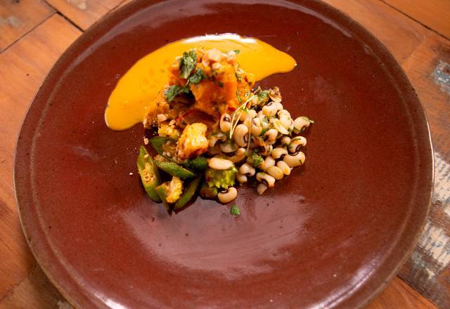 Prato Principal – Já no prato principal, os chefs apostaram em um maxixe e quiabo salteados, abóbora cozida com azeite de dendê e vinagrete de feijão verde – Foto: Divulgação/Record TV - 7 de 8