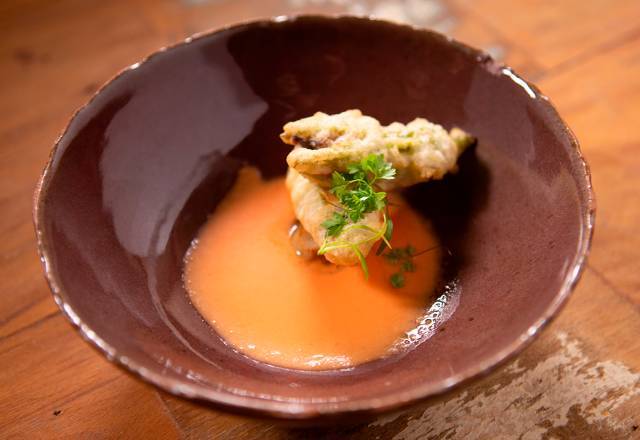 Time Laranja – Entrada – A Equipe Laranja, composta por Bruno, Luciana, Michele, Natália e Taty, iniciou seu menu com um gaspacho de melancia com flor de abobrinha recheada de funghi e macadâmia – Foto: Divulgação/Record TV - 6 de 8
