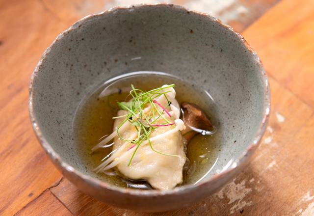 Time Azul – Entrada – A Equipe Azul, composta por César, Lara, Lucas, Marê e Maiara, foi a primeira a servir os jurados. A entrada foi um dumpling recheado de milho-verde, cogumelo e alho-poró sobre cogumelo eryngui – Foto: Divulgação/Record TV - 3 de 8