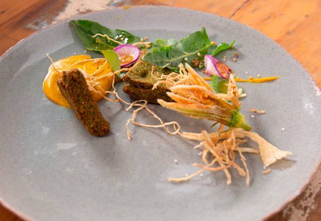 Prato Principal – Como prato principal, o time apostou em um falafel sobre purê de abóbora, crispy de alho-poró, flor de abobrinha frita e salada de azedinha com agrião – Foto: Divulgação/Record TV - 4 de 8