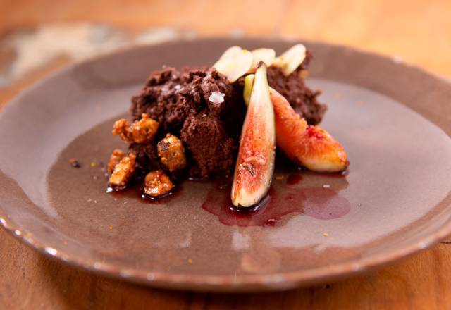 Sobremesa- Como sobremesa, um mousse de aquafaba com figo grelhado e suco de romã foi servido. O prato foi escolhido como o melhor do Teste de Fogo, garantindo um prêmio de R$ 10 mil para Natália, responsável pela receita vencedora – Foto: Divulgação/Record TV - 8 de 8