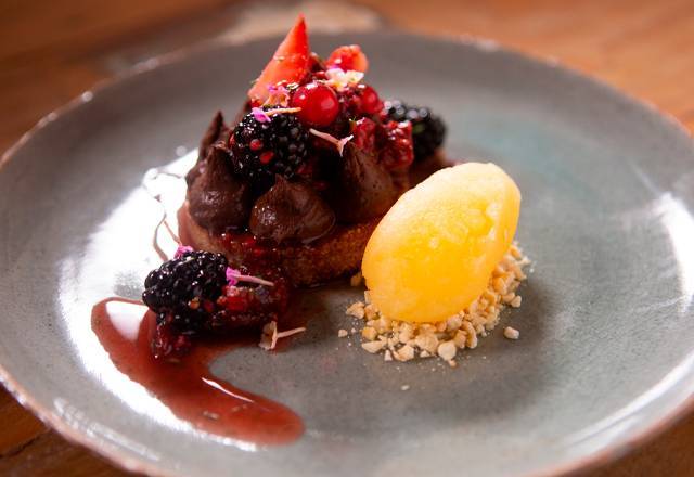 Sobremesa – Para finalizar o menu, foi servida uma torta de chocolate com frutas vermelhas maceradas e granita de laranja. O cardápio do Time Azul agradou muito os jurados e foi o grande vencedor do Teste de Fogo. A vitória trará uma vantagem para cada integrante na próxima prova! – Foto: Divulgação/Record TV - 5 de 8