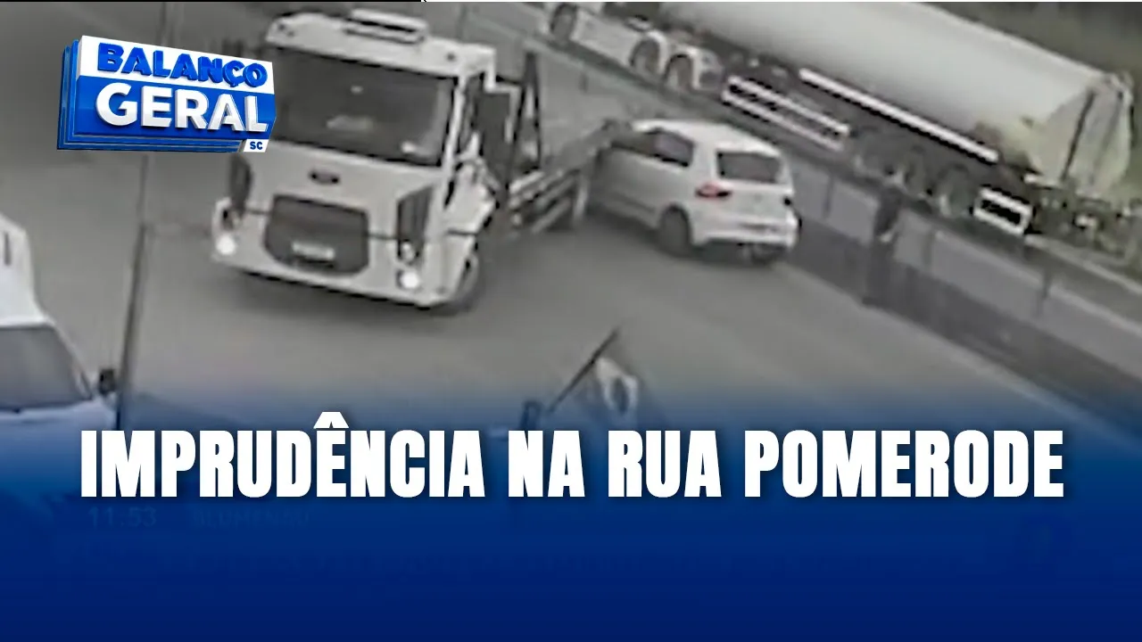 Imagem de uma câmera de segurança mostra o momento em que um caminhão manobra na rua Pomerode, no bairro Salto do norte, quando de repente é atingido por um carro.