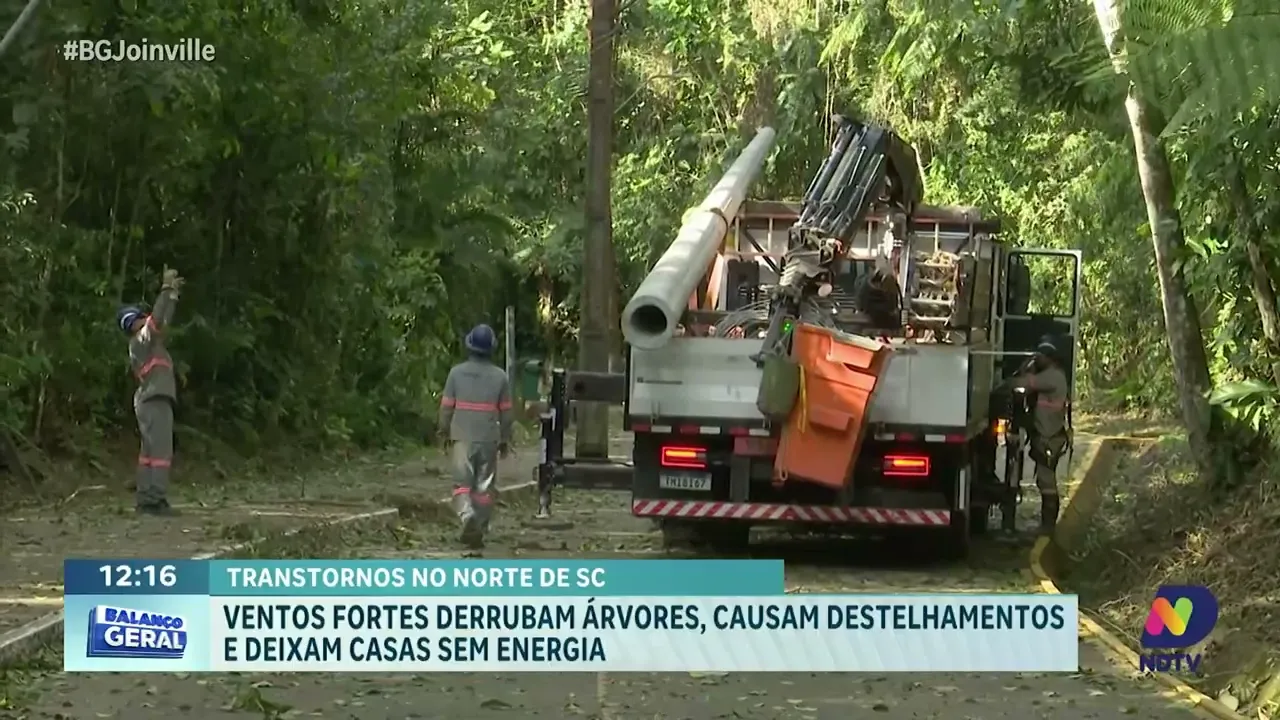 Ventos fortes provocaram estragos no Norte de Santa Catarina, especialmente em Joinville, onde árvores caíram, estruturas foram arrancadas e mais de 24 mil unidades da Celesc ficaram sem energia. A reportagem mostra os principais transtornos registrados após o temporal.